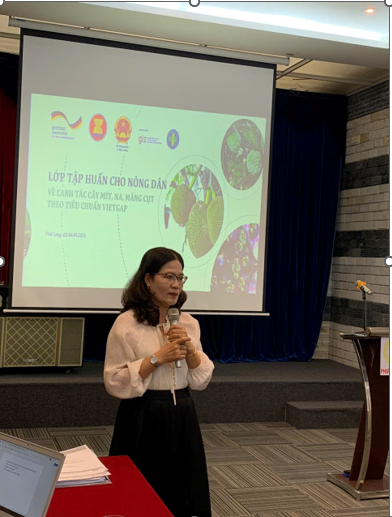Phát biểu của chuyên gia Viện Cây ăn quả miền Nam Tại lớp tập huấn, Tiến sĩ Trần Thị Mỹ Hạnh, Trưởng Bộ môn Bảo vệ thực vật Viện Cây ăn quả miền Nam đánh giá cao việc tổ chức lớp huấn luyện giảng viên (TOT) và tập huấn nông dân (TOF) về canh tác cây mít, na (mãng cầu) và măng cụt theo tiêu chuẩn VietGAP.