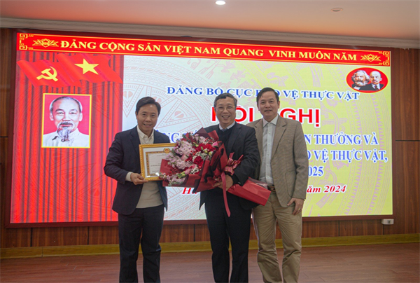 Công bố Quyết định khen thưởng và kiện toàn Đảng ủy Cục Bảo vệ thực vật nhiệm kỳ 2020-2025 Ngày đăng: 01/03/2024 Lượt xem 4939 Chiều ngày 01/03/2023, với sự chủ trì của Ban Tổ chức Đảng ủy Bộ Nông nghiêp và Phát triển nông thôn, tại Cục Bảo vệ thực vật đã diễn ra lễ công bố Quyết định khen thưởng cho Thứ trưởng Bộ Nông nghiệp và phát triển nông thôn Hoàng Trung, nguyên bí thư Đảng ủy Cục Bảo vệ thực vật, đồng thời quyết định đồng chí Hoàng Trung thôi tham gia Ban chấp hành Đảng ủy Cục. Đây là thành tích đặc biệt xuất sắc của Đồng chí Hoàng Trung trong vai trò Bí thư Đảng ủy, Cục trưởng Cục Bảo vệ thực vật đã lãnh đạo Cục Bảo vệ thực vật 5 năm liên tiếp được Đảng ủy Bộ xếp loại Hoàn thành xuất sắc nhiệm vụ. Đồng chí Nguyễn Văn Trường, Phó Bí thư thường trực Đảng ủy Bộ Nông nghiệp và PTNT trao Quyết định khen thưởng cho Thứ trưởng Hoàng Trung và Quyết định chỉ định Bí thư Đảng ủy Cục BVTV cho Cục trưởng Huỳnh Tấn Đạt Đồng chí Phan Văn Đương, Trưởng ban Tổ chức Đảng ủy Bộ cũng đã công bố Quyết định chỉ định đồng chí Huỳnh Tấn Đạt giữ chức vụ bí thư Đảng ủy Cục Bảo vệ thực vật, thay đồng chí Hoàng Trung (đã nhận nhiệm vụ mới) và quyết định bổ sung Ủy viên BCH Đảng bộ Cục Bảo vệ thực vật, nhiệm kỳ năm 2020-2025 đối với hai đồng chí Nguyễn Quang Hiếu và đồng chí Nghiêm Quang Tuấn để kiện toàn nhân sự của Đảng ủy Cục Bảo vệ thực vật nhiệm kỳ 2020-2025. Như vậy, hiện nay Ban chấp hành Đảng ủy Cục Bảo vệ thực vật gồm: 1. Đ/c Huỳnh Tấn Đạt, bí thư Đảng ủy 2. Đ/c Nguyễn Quý Dương, Phó bí thư 3. D/c. Nguyễn Trọng Ái, Uỷ viên 4. Đ/c Nguyễn Quang Hiếu, Ủy viên 5. Đ/c Nghiêm Quang Tuấn, Ủy viênĐồng chí Nguyễn Quang Hiếu và đồng chí Nghiêm Quang Tuấn nhận quyết định Ủy viên BCH Đảng ủy Cục BVTV